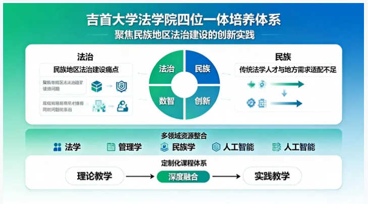 作为扎根武陵山片区的高校法学教育阵地,吉首大学法学院始终聚焦民族地区法治建设痛点,直面传统法学人才培养与地方需求适配不足的问题。成果核心在于构建了 “法治-民族-数智-创新” 四位一体的培养体系,打破传统法学教学的学科壁垒,创新性整合法学、管理学、民族学、人工智能等多领域资源,打造“理论+实践”深度融合的定制化课程体系。